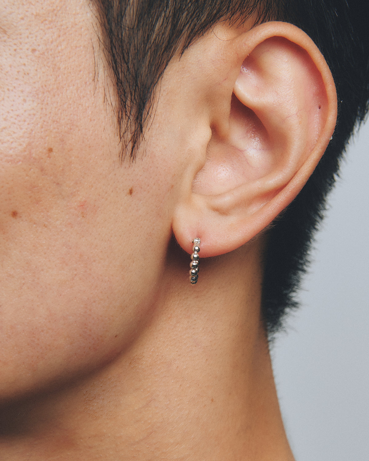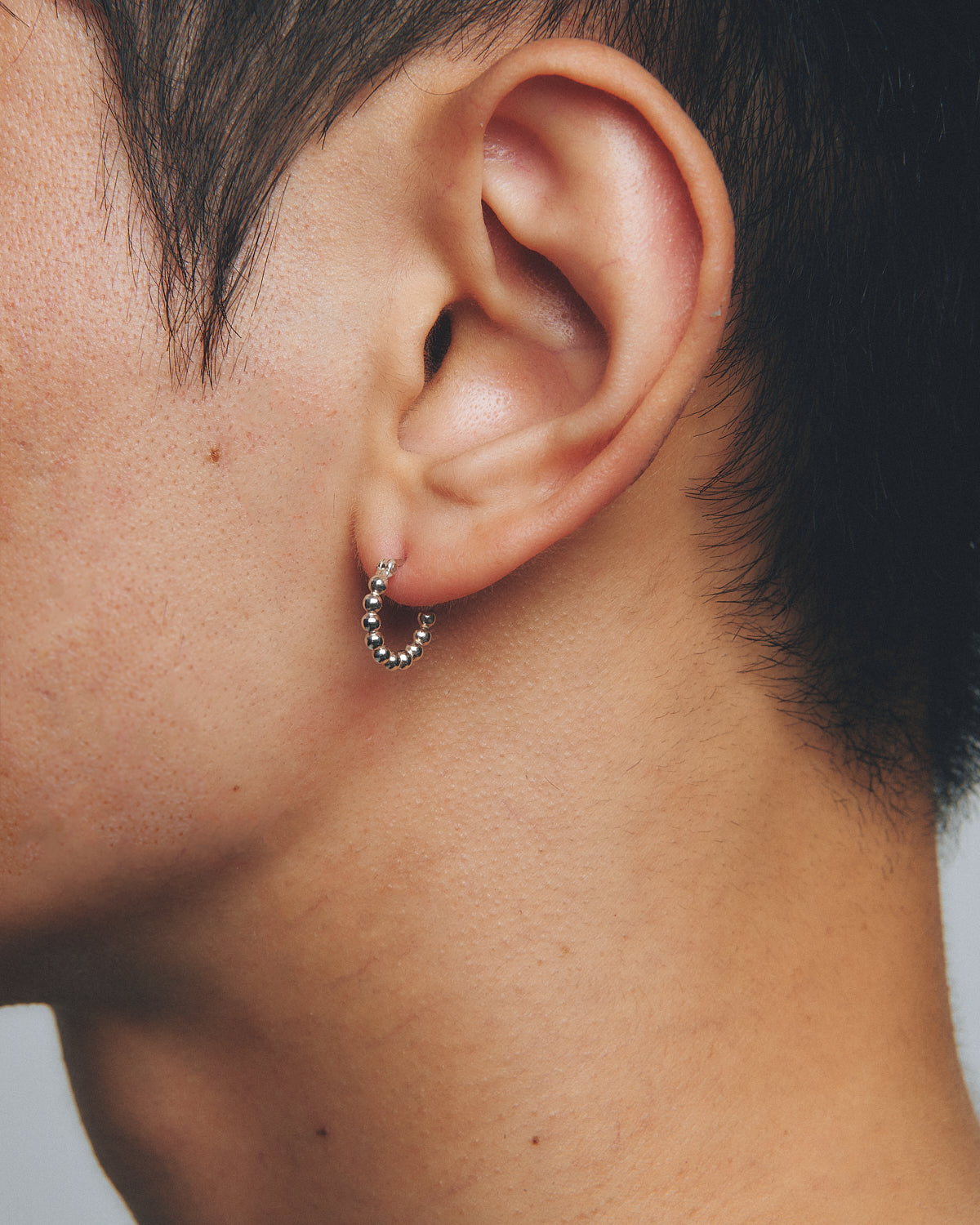 シルバーフープに、小さな粒々が連なったデザインのピアス。