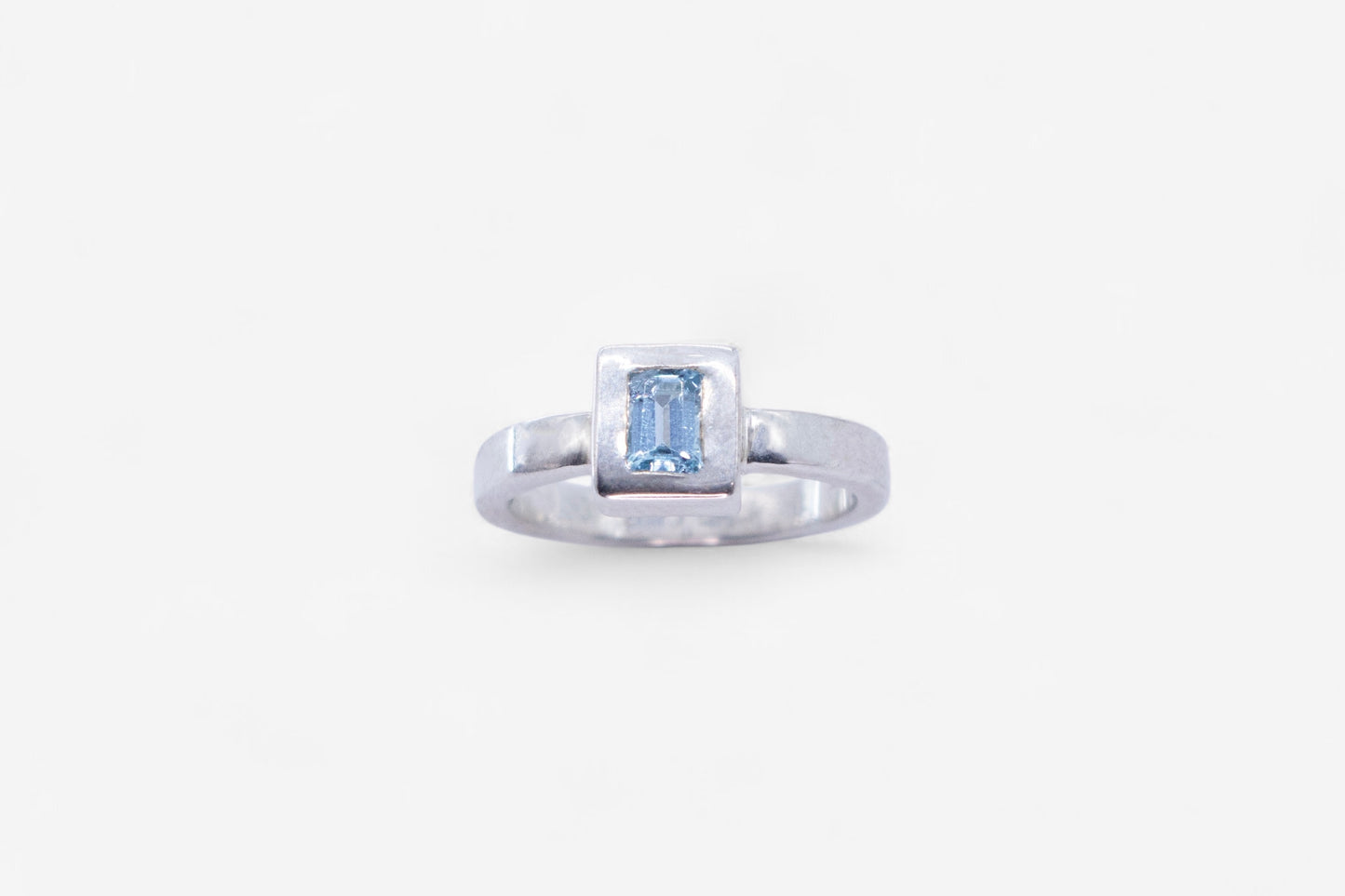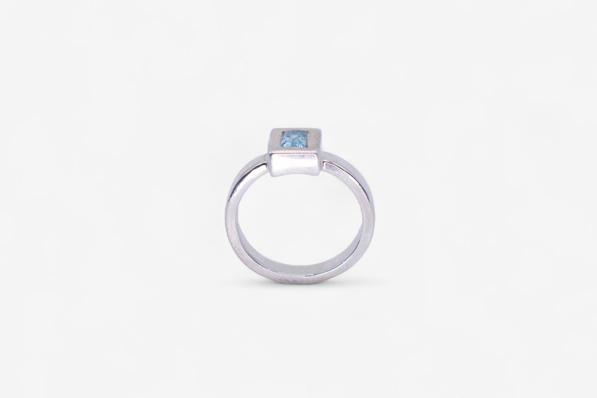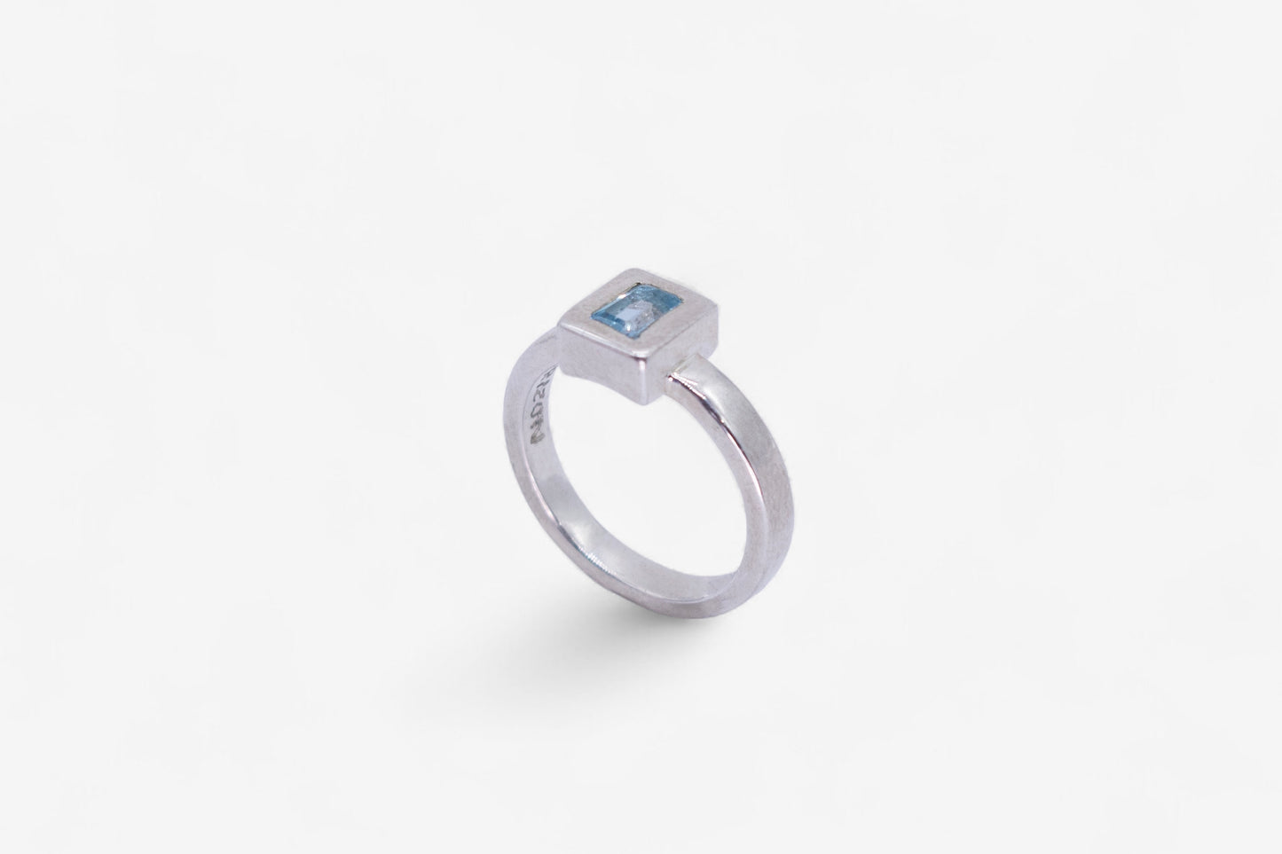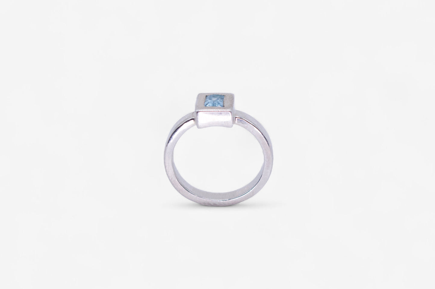 ミニマルな四角い構造体に、スイスブルートパーズを沈めたリング。