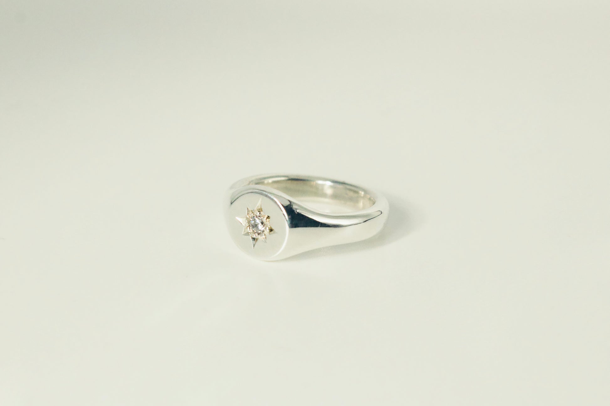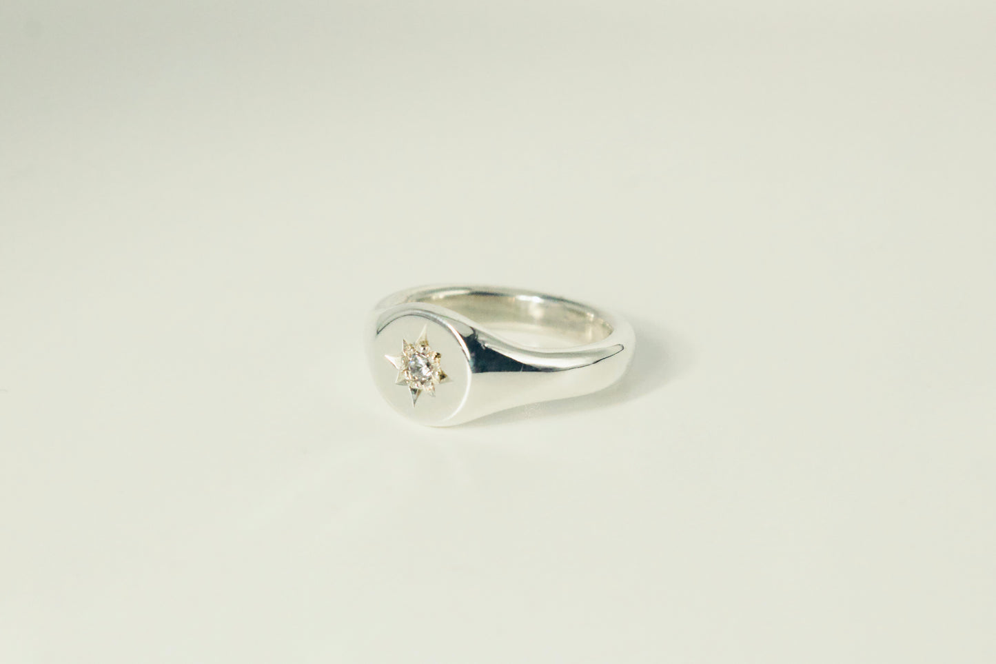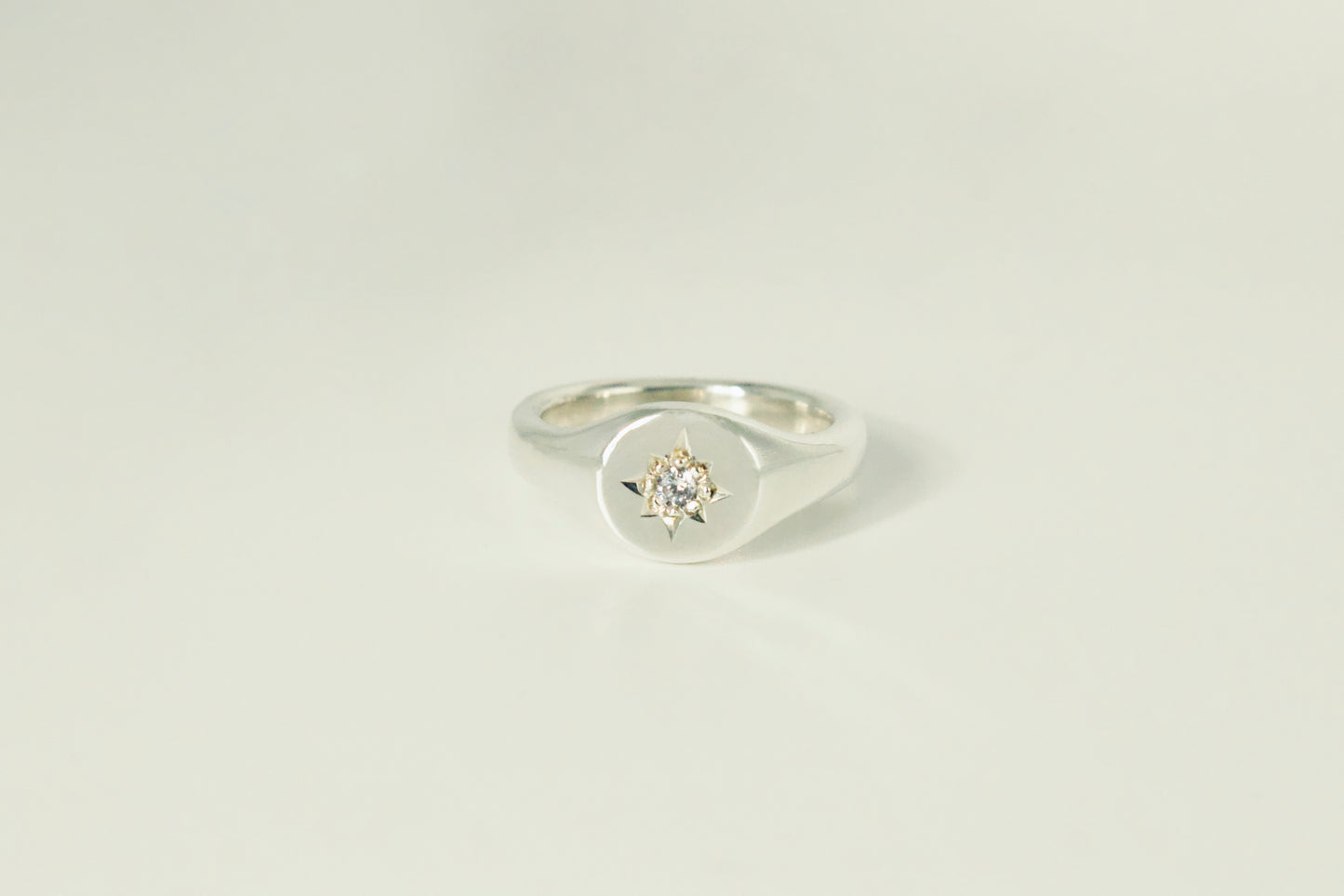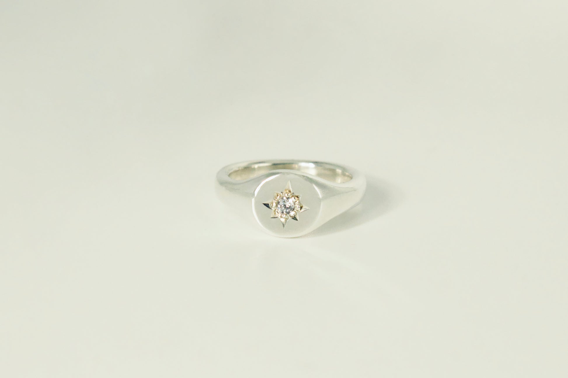 職人が手彫りで後光留めを施した丸いシグネットリング。