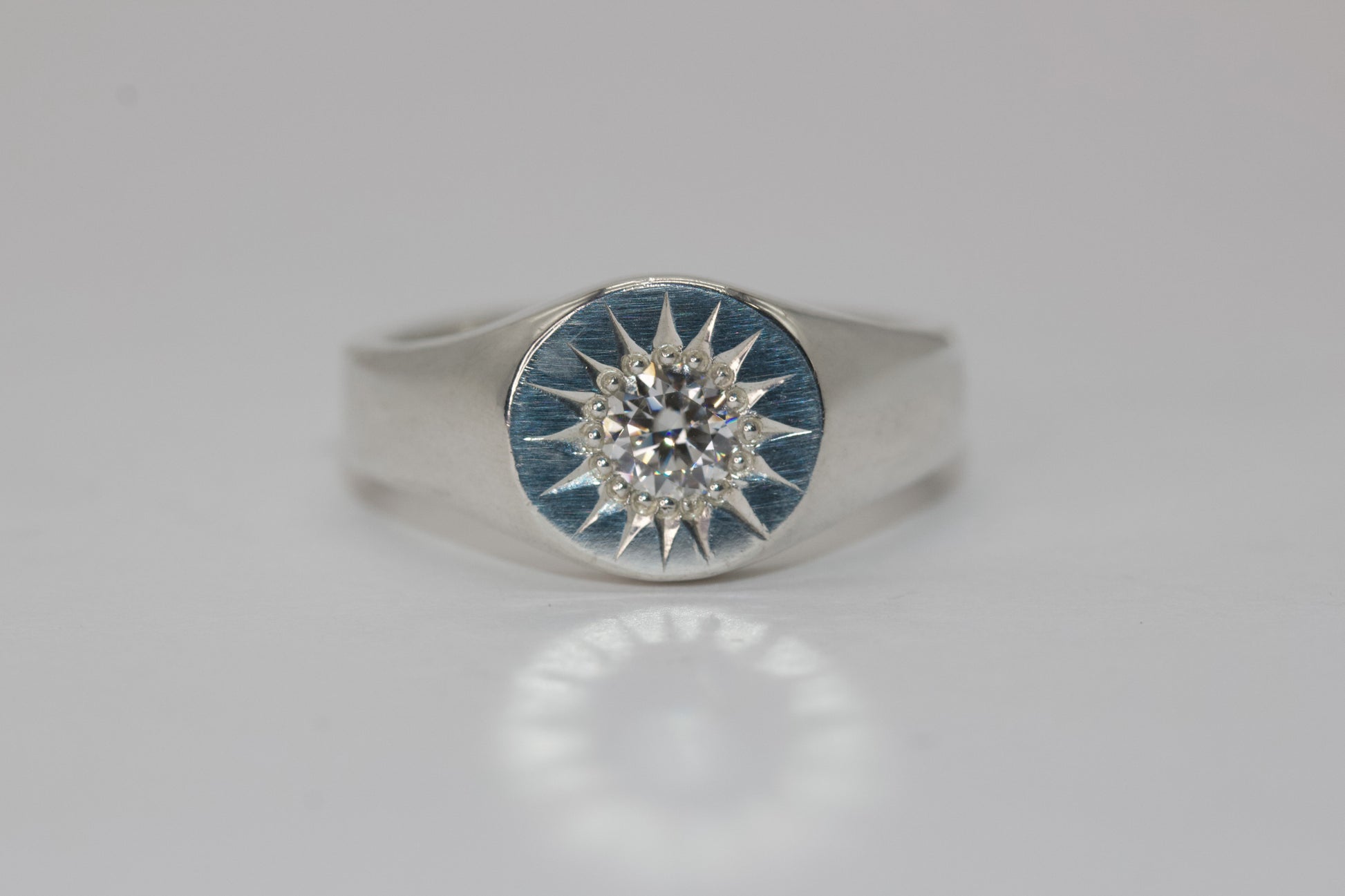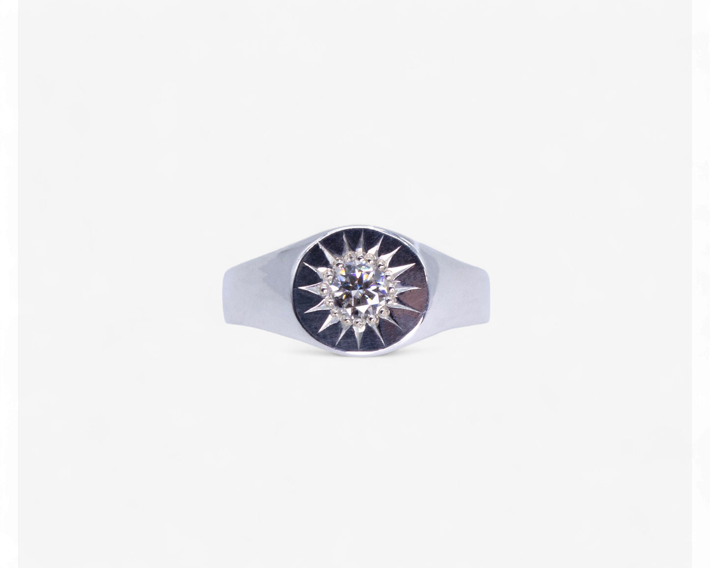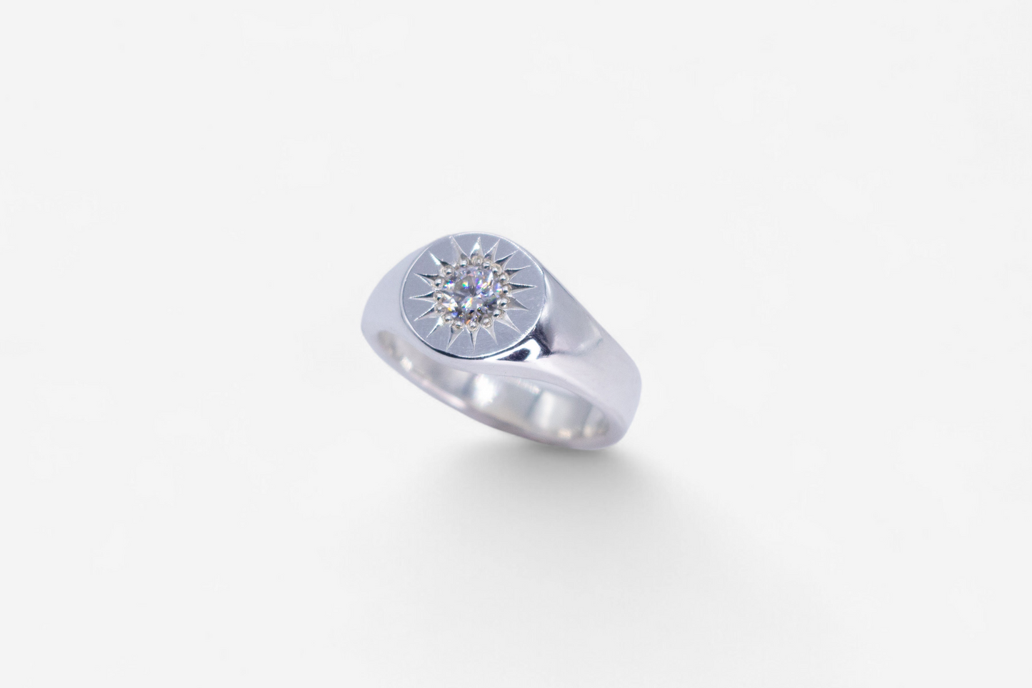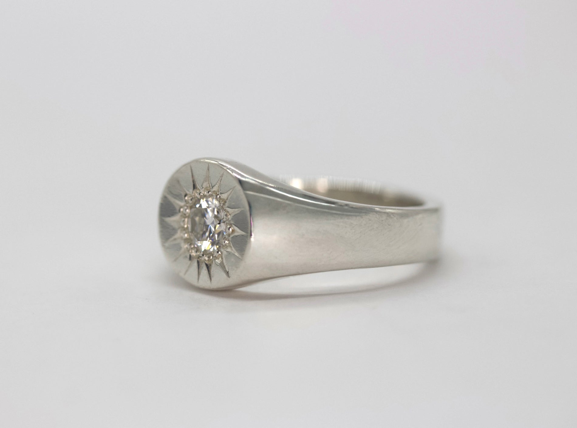 中央に配されたモアッサナイトを囲むように、放射線状の意匠が静かに広がる。