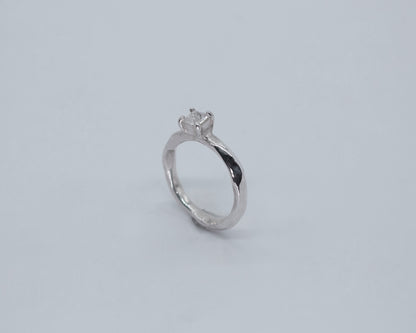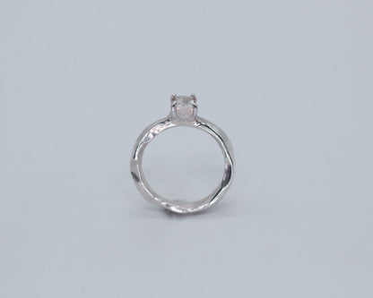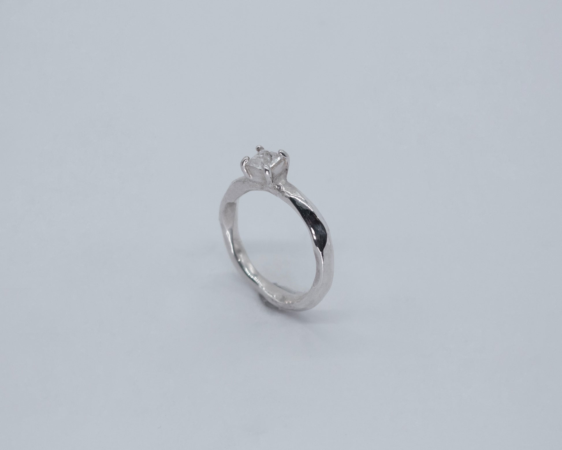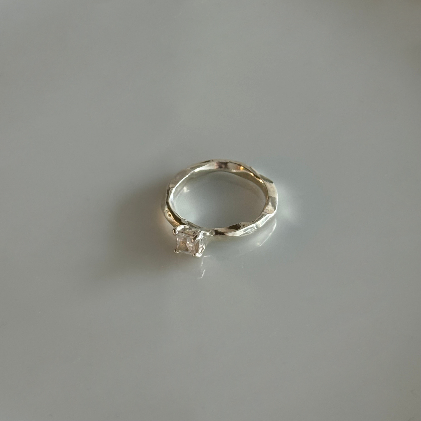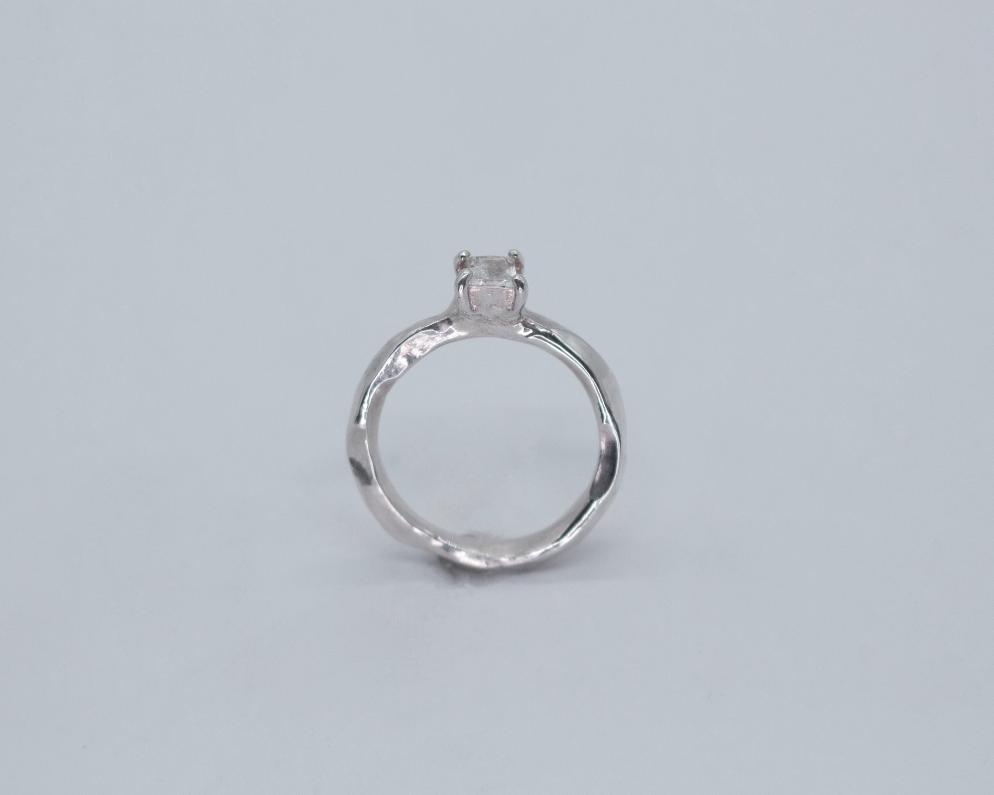 スクエアカットのホワイトトパーズが、荒れた質感の中で静かに佇む。