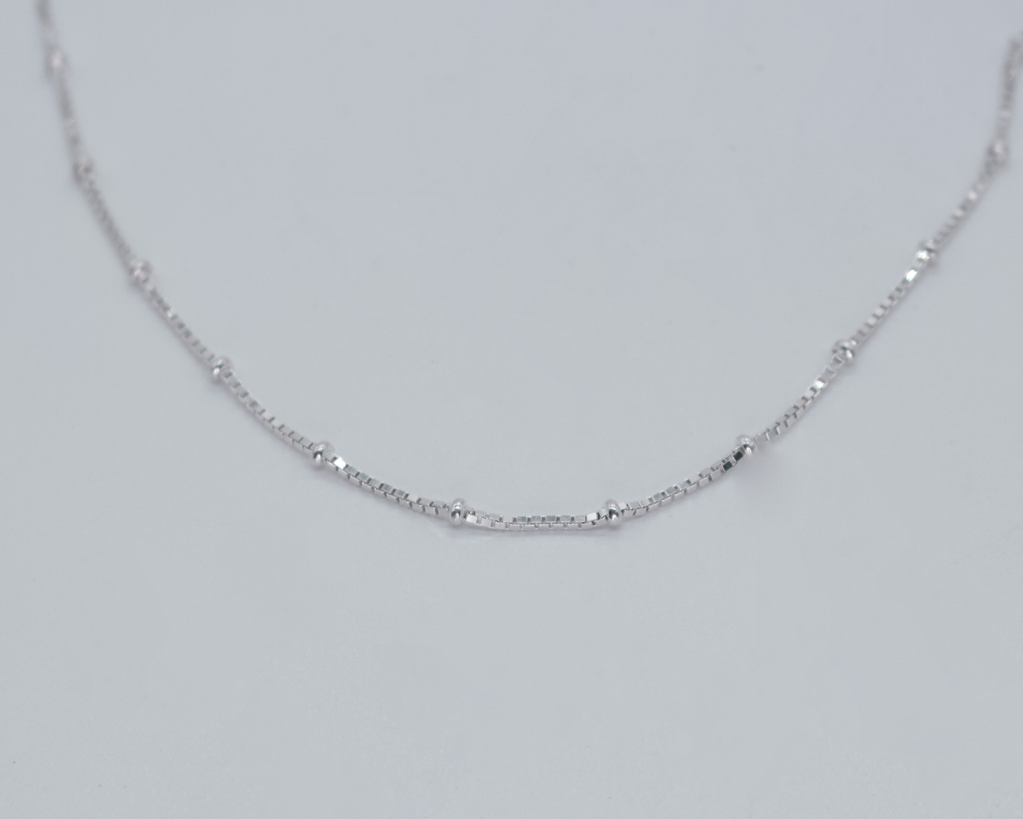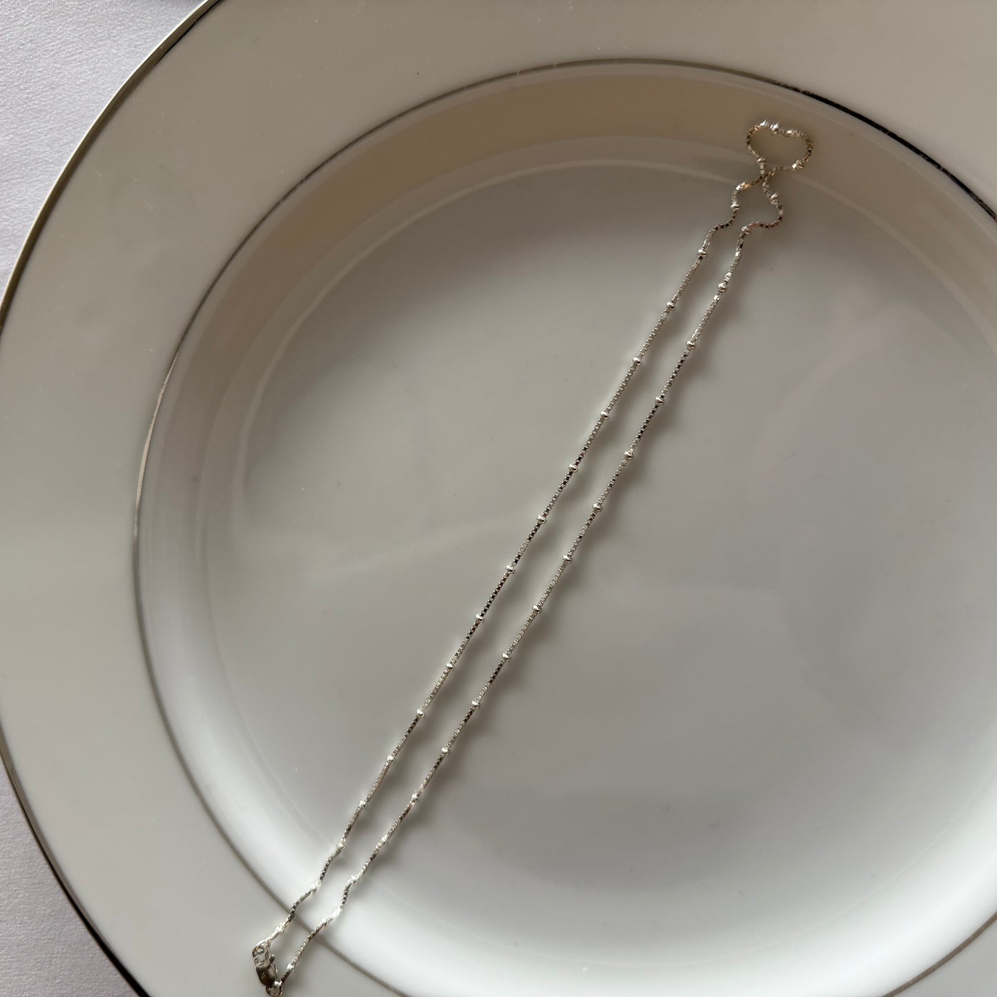 均等に並んだ小さな光の粒が、首元に静かな輝きを添えるネックレス。